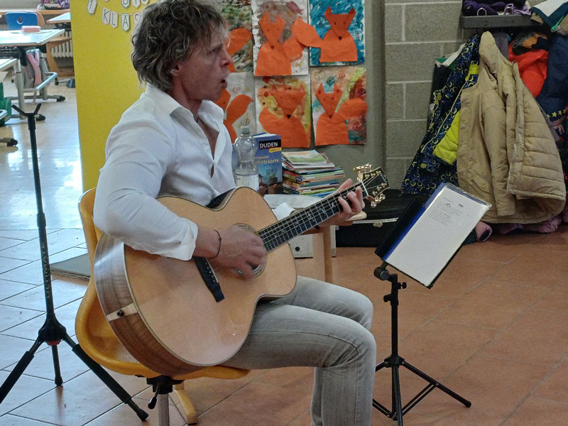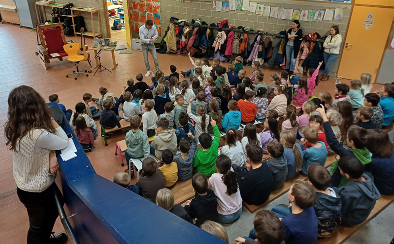 Zum Abschluss versammelten sich alle Klassen in der Aula, wo Martin Lenz noch einmal vor der gesamten Schulgemeinschaft auftrat. Auch hier gelang es ihm spielend, die Aufmerksamkeit der Kinder zu gewinnen und den Raum mit Energie und Wärme zu füllen.
