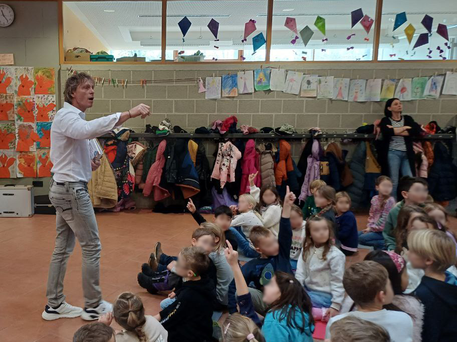 Zunächst besuchte er die 3. Klassen, wo er mit beeindruckender Lesestimme aus seinen Büchern vorlas. Mit viel Gefühl, Humor und spannenden Momenten zog er die Kinder sofort in den Bann seiner Geschichten. Durch seine lebendige Art gelang es ihm, jedem Satz Farbe zu verleihen – mal leise und geheimnisvoll, mal kraftvoll und mitreißend.